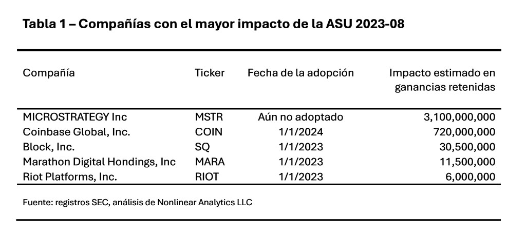 En diciembre 13, 2023, FASB adoptó la ASU 2023-08, que requiere que las compañías reporten ciertos activos digitales a valor razonable en el balance general, con los cambios de período-a-período en el valor razonable reportados como ingresos o pérdidas en el estado de ingresos.