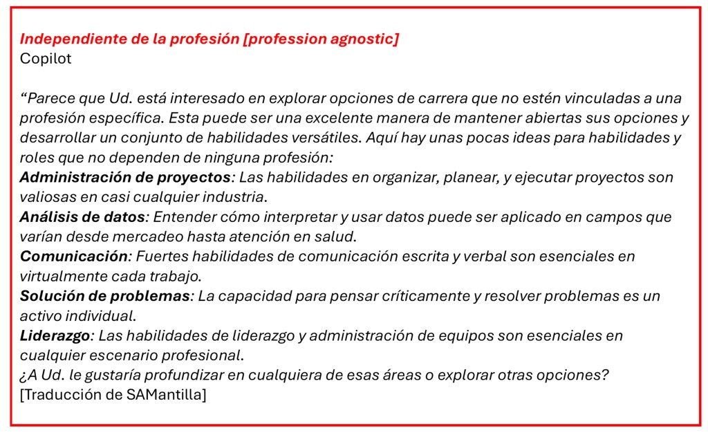 Le pregunté a Copilot qué significa profession agnostic. Su respuesta (20-11-2024) aparece en la siguiente gráfica que también incluye la imagen de la presentación oficial (‘para los incrédulos’).
