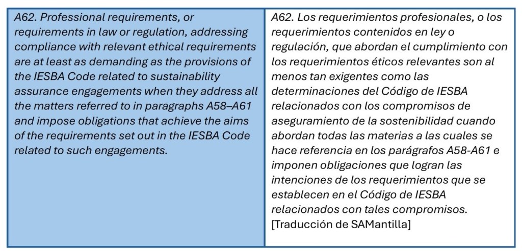 Mientras tanto, será necesario revisar en profundidad las expresiones relacionadas con el Código de Ética de IESBA en lo que tiene que ver con los requerimientos de tal Código en relación con los compromisos de aseguramiento de la sostenibilidad. Sobre el particular, el parágrafo A62 del ISSA 5000 es bien importante, tal y como se ve en la gráfica que aparece a continuación: