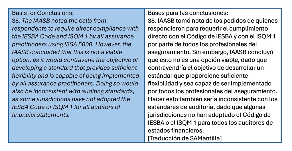 En otras palabras: hay profesionales del aseguramiento de la sostenibilidad a quienes obliga el Código de IESBA y el ISQM1, pero también hay otros profesionales del aseguramiento de la sostenibilidad a quienes no le obligan esos estándares mencionados.