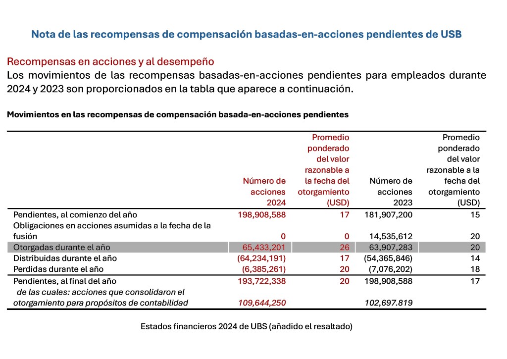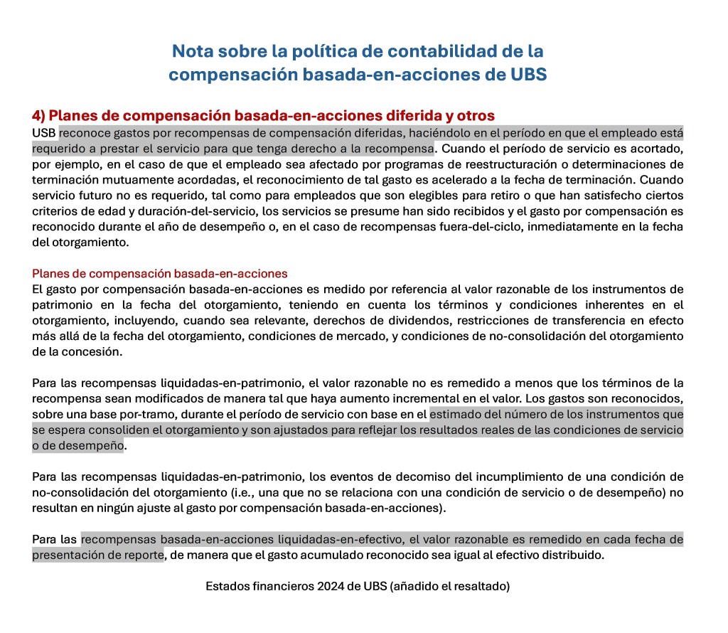 UBS otorga patrimonio a sus empleados como parte de sus bonos anuales. Si bien los otorgamientos ocurren en febrero, se basan en el desempeño del empleado y de la compañía en el año precedente. La anterior referencia al “período en que el empleado está requerido a prestar servicio para que tenga derecho a la recompensa” por consiguiente incluye el año antes del otorgamiento. Las recompensas en febrero de 2025 serán parcialmente reconocidas en los resultados del año 2024 y parcialmente en los siguientes 3 años para reflejar su consolidación del otorgamiento graduada en 3-años.