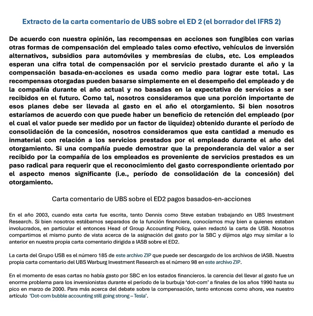 Nosotros nunca hemos estado cómodos con el diferir según el IFRS 2 (y los US GAAP) de parte del valor de la SBC otorgada con relación a un período particular. Nosotros pensamos que las condiciones de servicio y desempeño anexas a las recompensas en sí mismas no justifican el diferir y que la mayoría o toda la compensación es una recompensa por servicios de empleo actuales o pasados. Además, UBS parece estar de acuerdo con nosotros – o al menos UBS lo hizo en 2003 cuando presentó su carta comentario a IASB con relación al borrador para discusión pública del eventual IFRS 2. Esto es lo que dijeron…