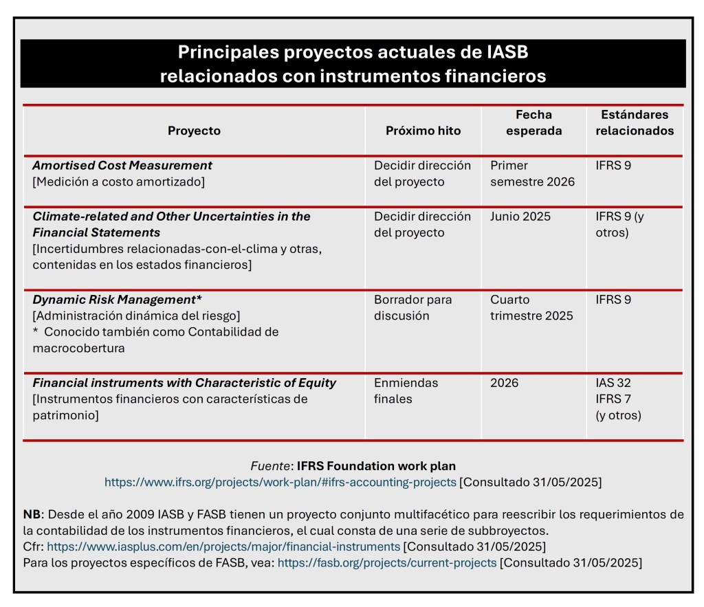 En la siguiente tabla puede observarse que actualmente IASB tiene distintos proyectos relacionados con instrumentos financieros, caracterizados principalmente porque su horizonte es bastante largo, ya sea porque apenas se va a decidir la dirección del proyecto o se va a emitir el borrador para discusión pública.