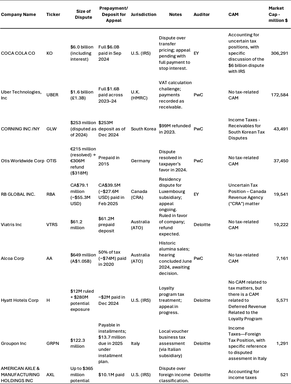 La tabla que aparece adelante esboza las disputas tributarias materiales reveladas por las compañías que se negocian públicamente y tienen sede en Estados Unidos, que clasificaron los pagos de efectivo para facilitar una apelación, haciéndolo como un activo en el balance general. Las disputas involucran autoridades tributarias internacionales y locales y a menudo se refieren a problemas complejos tales como precios de transferencia, tratamiento del IVA, y transacciones entre compañías. Las disputas abarcan un rango amplio de jurisdicciones, años tributarios, y potenciales impactos financieros.