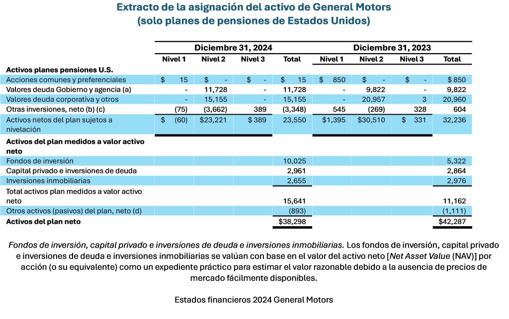 En el año 2024, Ford tenía el 14% de sus activos medidos a valor del activo neto y GM el 41%. La asignación del activo de los activos del plan de pensiones de Estados Unidos de General Motor se muestra a continuación.