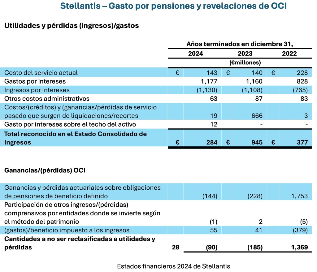 Si el gasto por intereses neto es incluido en utilidad operacional o como un componente del gasto financiero neto actualmente no está especificado según los IFRS. El enfoque mayoritario (y que es adoptado por Stellantis) es parte del gasto financiero, que también es consistente con cómo pensamos que esto debe ser analizado. Una vez que el IFRS 18[7] se vuelva obligatorio en el año 2027, todas las compañías tienen que reportar el gasto por intereses de pensiones neto debajo de la utilidad operacional como un componente de ingresos o gastos financieros.