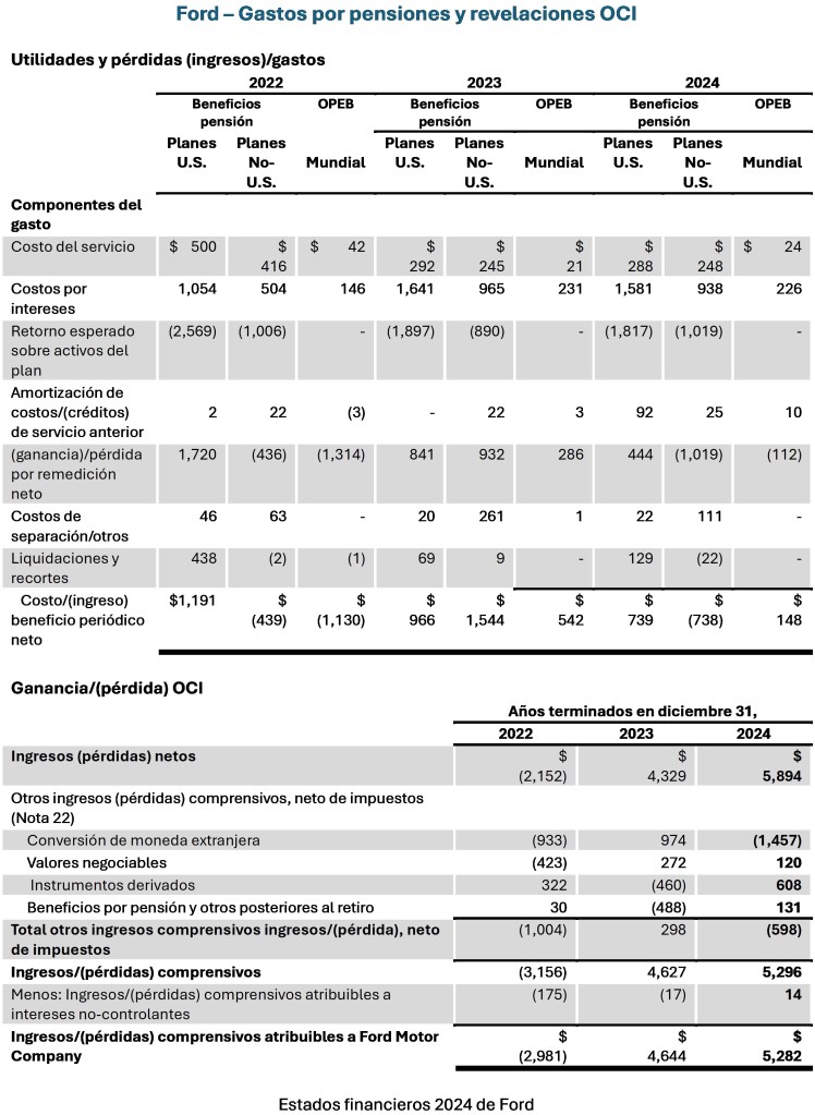 Si bien la mayoría de quienes reportan US GAAP aplican el método corredor para la contabilidad de pensiones, se permite una alternativa. Esta es cuando las ganancias y pérdidas actuariales diferidas en OCI en lugar de ello inmediatamente son reconocidas en utilidad y pérdida. Esto también elimina el reciclaje de ganancias y pérdidas actuariales pasadas. Ford usa este enfoque. En los extractos que aparecen adelante, la línea ‘(ganancia)/pérdida por remedición neta’ es el elemento que habría sido reportado (y subsiguientemente reciclado, sujeto al efecto corredor) en OCI. Observe que en OCI todavía hay un elemento de pensiones – este es el costo de servicio pasado y el reciclaje de esto en utilidad y pérdida se muestra como ‘Amortización de costos de servicio anteriores’ en la desagregación del gasto en utilidad y pérdida.