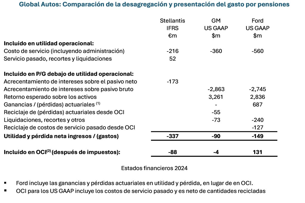 Los IFRS y los US GAAP también difieren en términos de presentación, con los costos relacionados con servicio pasado, liquidaciones y recortes siendo reportados en utilidad operacional por Stellantis, pero debajo de utilidad operacional y como parte de ‘otros ingresos y gastos’ por Ford y GM.