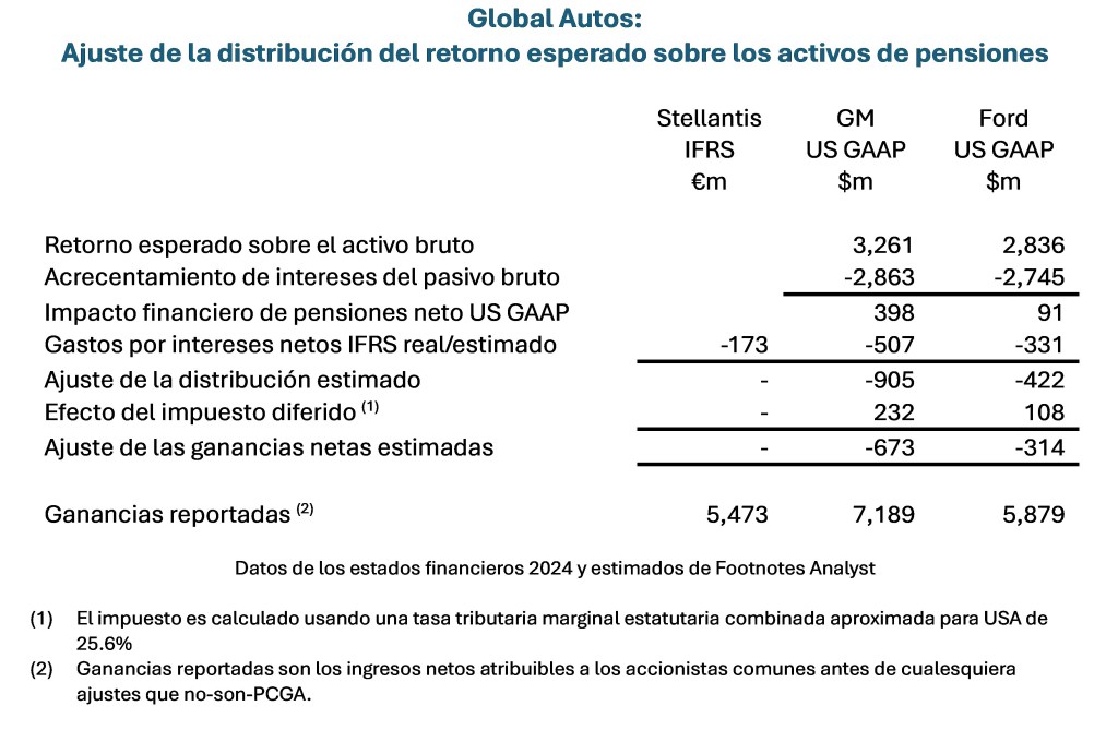 No obstante que nuestros ajustes son estimados, parece que la distribución del retorno sobre el activo de pensión esperado incluida en los resultados US GAAP de General Motors y de Ford sea material. Solo mediante remover esto los resultados de esas tres compañías serán comparables.