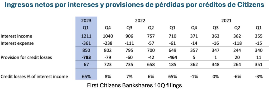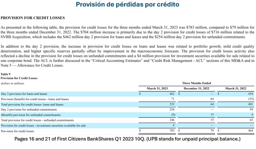Adelante se encuentran los datos del Citizens Bank que usamos en nuestro artículo de 2023 para ilustrar el problema. Observe la gran pérdida por deterioro en el Q1 2023 que está significativamente fuera de línea con los trimestres anteriores. Esto (y la pérdida similar en el Q1 2022) se debe principalmente al engañoso efecto del día 2 para los préstamos adquiridos en el período. La cantidad exacta de este efecto del día 2 es desagregada en la tabla final que aparece abajo.