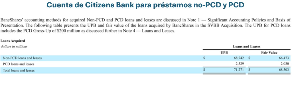 La primera tabla de los estados financieros de Citizens Bank muestra los préstamos adquiridos en el trimestre. Los préstamos con crédito deteriorado comprados [purchased credit deteriorated (PCD)] tienen un valor razonable significativamente más bajo que la cantidad principal pendiente. La mayor parte de esto se deberá a las pérdidas por crédito esperadas. Sin embargo, esta cantidad no es la causa de la pérdida engañosa del día 2 a causa de la aplicación del método del cálculo bruto. Esos préstamos se reconocerían a su valor razonable en la fecha de adquisición.[2]