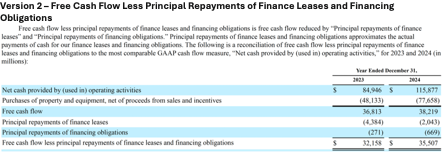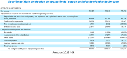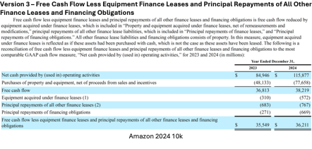 - Versión 1 del FCF de Amazon: La primera (y única en el 2025) medida del flujo de caja libre que no-es-PCGA presentada por Amazon es igual al flujo de caja de operación, menos el desembolso de capital (producidos netos a partir de las disposiciones), presentadas ambas en el estado de flujos de efectivo. El flujo de efectivo de operación es la medida estándar de los US GAAP, que incluye intereses y tributación (a diferencia de quienes reportan IFRS donde el flujo de efectivo de operación a menudo excluye los pagos de intereses). El desembolso de capital es el efectivo pagado con relación a compras de activos y no incluye los pagos del principal según los arrendamientos financieros, el cual aparece como flujos de salida de efectivo de financiación en el estado de flujos de efectivo. El desembolso de capital también excluye cualquier incremento en los activos de derechos-de-uso de arrendamiento. Sin embargo, esta medida del flujo de caja libre incluye el elemento intereses de los pagos de arrendamiento financiero y todos los pagos de alquiler por los arrendamientos de operación, considerando el método presentación de ‘gasto de arrendamiento único’ según los US GAAP[1].