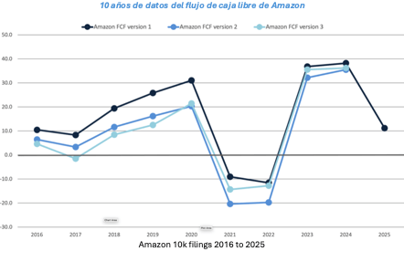 Las versiones 2 y 3 permiten los efectos del flujo de caja de los arrendamientos financieros, si bien con interpretaciones diferentes de ese flujo de caja. La versión 1 excluye cualesquiera efectos del flujo de caja de los arrendamientos financieros, y por consiguiente las versiones 2 y 3 siempre tienen que ser más bajas (o iguales) que la versión 1. En el último par de años, las 3 diferentes medidas de Amazon respecto del flujo de caja libre han convergido de alguna manera debido a una reducción en el uso de los arrendamientos financieros. En los primeros años las diferencias fueron más pronunciadas, y esto bien podría volver si, por ejemplo, Amazon usa más arrendamientos financieros para su expansión del desembolso de capital para IA.