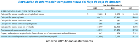 Extender el enfoque a todos los arrendamientos financieros es sencillo, dadas las revelaciones complementarias a los estados del flujo de efectivo proporcionadas por Amazon. Simplemente deduzca el elemento de línea “Propiedad y equipo adquirido según arrendamientos financieros” que es revelado como datos complementarios al estado de flujos de efectivo, de manera que para el 2025 son los $2,911m, tal y como se muestran en la nota que aparece adelante. No se necesita ajuste adicional.