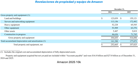 La cuenta por pagar con relación a las compras de activos fijos es revelada por Amazon en la nota de propiedad y equipo (PPE) (vea el ultimo parágrafo en el siguiente extracto).